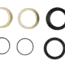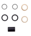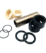The flanged bushing eyelet hardware assembly is made up of two beige colored flanged bushings that are pressed into the shock eyelet. A hollow pin is pushed through the flanged bushings and centred by black Delrin spacers on either side of the eyelet. Thin o-rings go between the spacers and flanged bushings to prevent contamination and premature bushing wear.